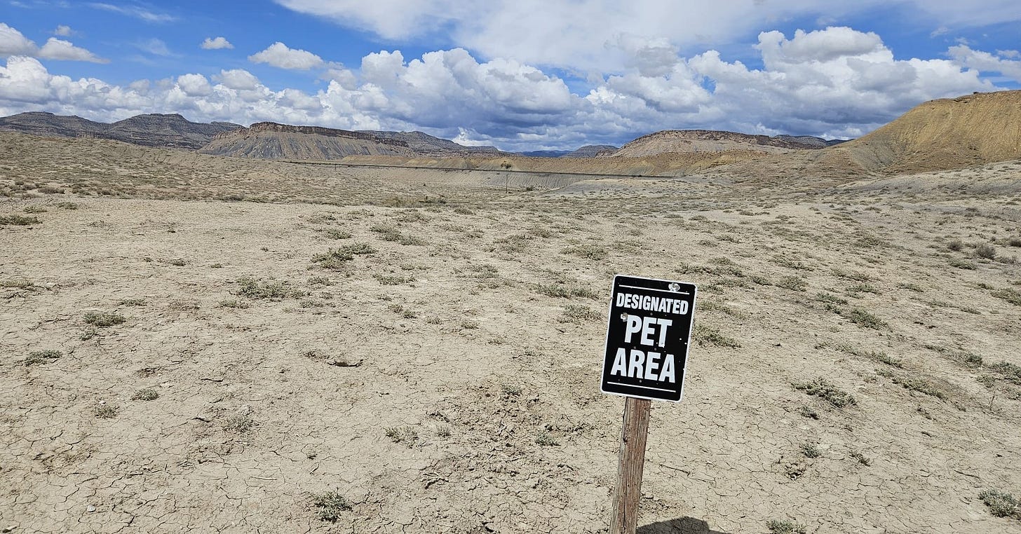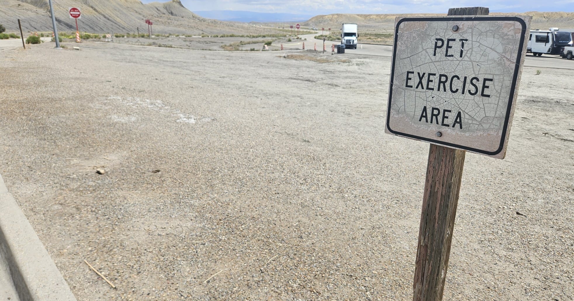 There were actually two "designated" pet areas. One was across the parking lot—a dusty gravel strip proudly labeled PET EXERCISE AREA, though it looked like it hadn’t been exercised since the Jurassic era. The other was tucked behind the rest area building, marked with a single stake in a wide, sun-blasted expanse of cracked desert and a faded sign: DESIGNATED PET AREA. No trees. No water. No hint of grass. Just heat, dust, and the unmistakable feeling that whoever designed this setup had never met a dog.